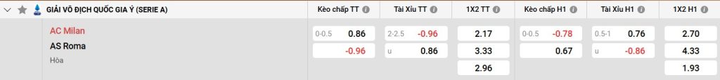 - Kèo châu Á: AC Milan -0.25 / 0.86
