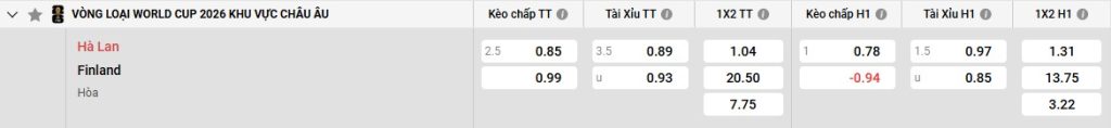 Tỷ lệ cược nghiêng hẳn về Hà Lan, phản ánh sự chênh lệch về đẳng cấp và chiều sâu đội hình. Với thành tích sân nhà, hàng công mạnh mẽ, và lịch sử đối đầu gần đây, bất kỳ chiến thắng dễ dàng nào của Hà Lan đều sẽ là một cú sốc. Thị trường có hơi đánh giá quá cao khả năng ghi bàn, nhưng với đội hình Phần Lan và động lực của đội chủ nhà, kịch bản này vẫn có khả năng xảy ra nhất.